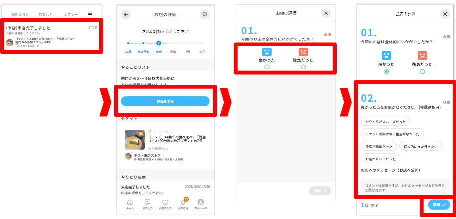 2. やりとり>採用された>評価をする>2段階評価(必須)とメッセージ(任意)を入力し「送信」をタップ